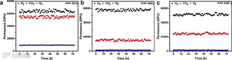 图3. iPAF-5膜的72h内的渗透量测试:(a)iPAF-5(Cl);(b)iPAF-5(Br);(c)iPAF-5(BF4)