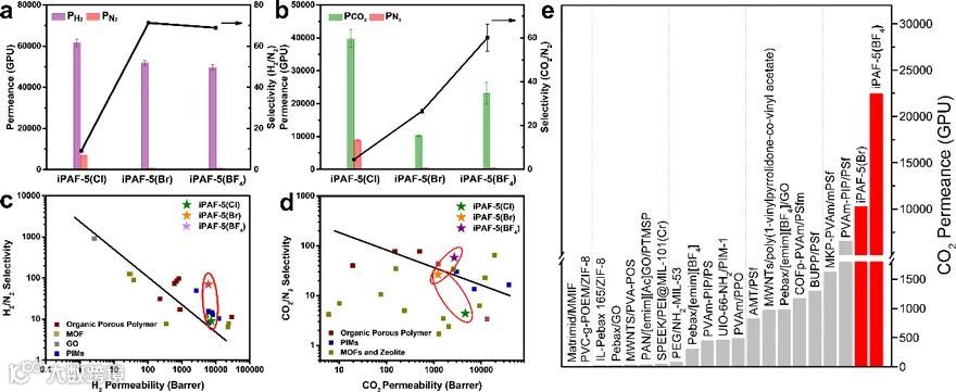 图2. (a)连续PAF膜对H2/N2混合组分的分离渗透量和选择性;(b)连续PAF膜对CO2/N2混合组分的分离渗透量和选择性;(c)连续PAF膜与文献报道的其它微孔连续膜对H2/N2混合组分的分离性能比较(黑色直线为2008年Robeson曲线);(d)连续PAF膜与文献报道的其他微孔连续膜对CO2/N2混合组分的分离性能比较;(e)iPAF-5(BF4)连续膜与文献报道的其它混合基质膜的对CO2渗透量的比较。
