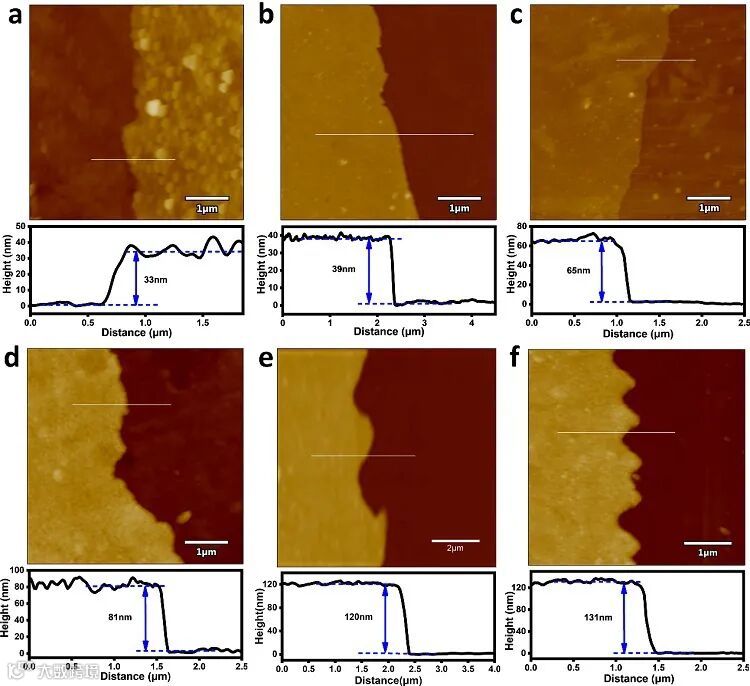 图1. PAF膜在不同生长时间边缘区域的AFM图像及对应的高度图。(a)6h;(b)12h;(c)24h;(d)48h;(e)72h和(f)84h。