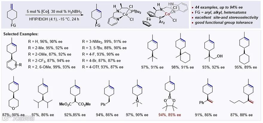 反应体系体现出广谱的底物适用性,对于4-位芳基、烷基以及杂原子取代的烯烃底物均能够获得较高的产率以及ee值,其中位阻效应对于反应对映选择性的控制至关重要(图2)。此外,作者选取双烯底物对于反应体系的化学选择性进行考察。当底物分子中含有两个碳碳双键时,钴催化剂能够精确识别不同双键结构的位阻大小,从而选择性迁移位阻较小的环外双键,以优异的位点选择性及对映选择性获得手性环状烯烃产物。