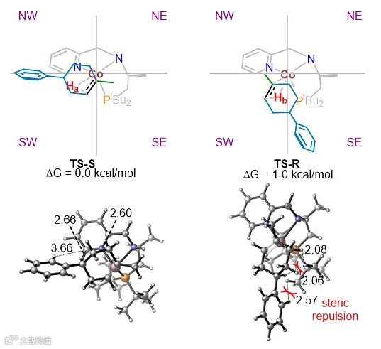 最后,作者利用DFT计算对于反应过程中的对映选择性决定步骤进行进一步研究,以揭示该反应的手性诱导机制(图4)。结果表明,β-氢消除过程中消除Ha (TS-S)相较于消除Hb (TS-R)是更加有利的过程(∆∆G = 1.0 kcal/mol),从而导致S构型产物为主要对映异构体。为了更加深入地了解控制反应对映选择性的关键因素,作者利用象限分析对两种过渡态的手性环境进行对比。配位层内的NW象限和SE象限分别被吡啶和叔丁基占据。由于叔丁基的空间体积较大,因此SE象限相比于NW象限是空间受阻的。这些由配体产生的手性口袋将会影响底物分子在空间中的取向。在优势过渡态TS-S中,左上象限NW相对空旷,可以被烯烃底物中体积较大的环己基苯所占据,而体积较小的甲基则占据空间较为拥挤的SE象限。然而,在非优势过渡态TS-R中,环己基苯被置于SE象限,导致配体中的膦配位基团与烯烃底物之间存在明显的相互排斥。理论计算与实验结果是高度一致的,其中烯烃底物和配体骨架的空间位阻是调控反应对映选择性的关键因素。