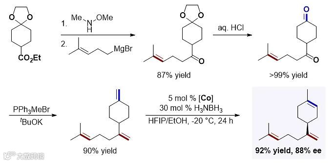 作者利用钴催化环外烯烃去对称异构化反应实现了天然产物β-红没药烯的简洁、高效合成(图3)。从商业可得的原料出发,经过四步简单的反应转化能够以78%的收率制备环外烯烃中间体,之后通过钴催化去对称异构化反应以92%的产率以及88%的ee 值获得天然产物β-红没药烯,首次实现了该天然产物分子的催化不对称合成,同时也凸显了手性钴催化体系在多烯异构化反应中的优异化学选择性。