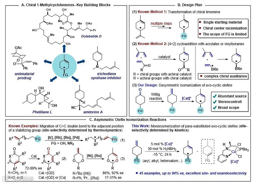 近日,清华大学刘强课题组在J. Am. Chem. Soc. 上发表了研究成果,通过钳形钴催化环外烯烃的去对称异构化反应策略,实现了手性六元环状烯烃类关键分子骨架的高效、高选择性合成。