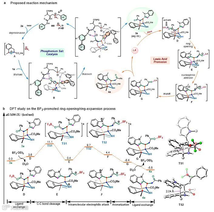 随后,为了理解路易斯酸介导的开环/扩环反应历程和不对称诱导的本质等核心科学问题,作者和南方科技大学余沛源教授合作对该反应机理进行了深入研究(图5)。结果表明:氮杂八元桥环产物的能量比七元桥环中间体的能量低5 kcal/mol,反应更趋向于生成热力学更稳定的氮杂八元桥环;结合实验手段阐述了立体选择性控制发生在手性季鏻盐催化的第一步环加成过程,路易斯酸介导的开环/扩环是底物诱导的转化过程且手性保持;季鏻盐催化剂的氢键和离子对双重活化作用在手性诱导中起到关键作用。