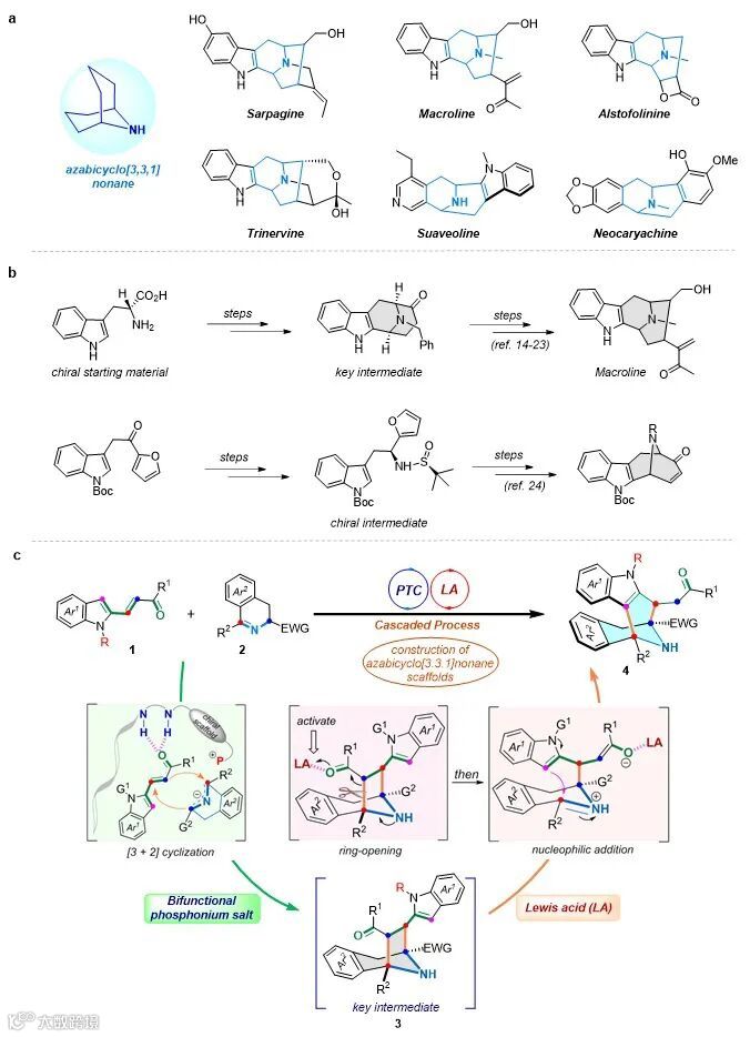 中(大)环骨架分子的催化不对称合成一直是有机合成化学研究的难点和前沿,而恰恰这类结构是众多药物及其中间体的核心结构单元,其中具有[3.3.1]结构的氮杂八元桥环是吲哚生物碱家族中一类重要核心骨架,研究表明该类骨架衍生物具有抗癌、抗抑郁和镇静等作用(图1a)。这类化合物早期是从稀有天然植物和海洋生物中提取,但这远远不能满足现实需求。目前人工合成手性[3.3.1]氮杂八元桥环化合物主要依赖于从手性起始原料通过全/半合成策略或者借助手性辅基经过多步反应得到(图1b),该方法具有反应步骤长、条件苛刻和原子经济性差等缺点。催化不对称合成[3.3.1]型类天然产物骨架的方法至今未见报道,这主要归结于[3.3.1]氮杂八元桥环分子结构独特且刚性、而且具有多个立体中心,经过简单的起始原料一步(一锅)构建该类手性结构具有重大挑战。