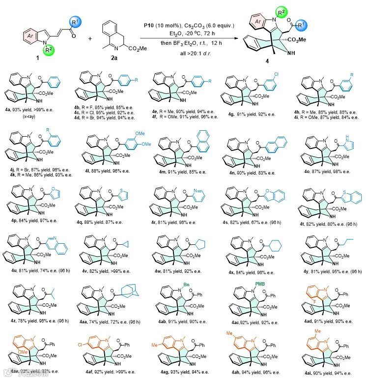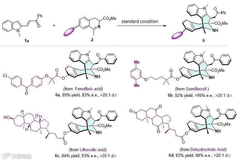 在优化反应条件之后,作者对底物的普适性进行考察。结果表明:该反应对一系列具有不同电性和取代基的吲哚烯烃都具有很好的普适性,以优秀的产率和立体选择性得到目标产物(图2)。同时,作者发现不同电性的取代基和保护基取代的环状亚胺叶立德也能很好的兼容该反应条件,都能以较好的收率和立体选择性得到相应的目标分子(图3)。值得一提的是,该反应能很好的进行药物分子的后修饰(图4)。