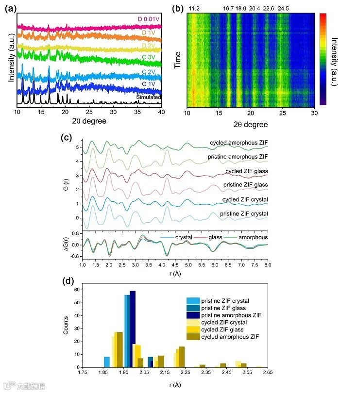 图3. MOF晶体、玻璃以及无定型MOF的非原位及原位XRD图谱。三种MOF样品在循环前、后的PDF分析。