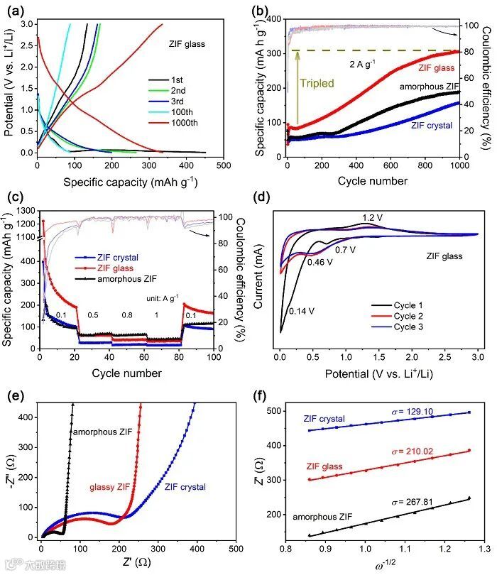 图2. MOF晶体、玻璃以及无定型MOF的充放电曲线、充放电、倍率曲线、CV曲线及阻抗图谱。