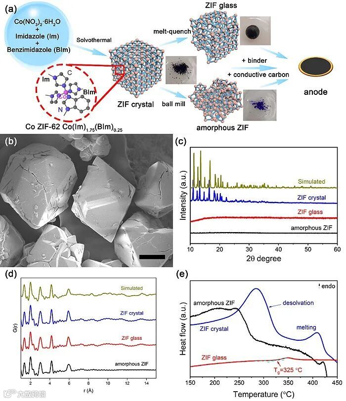 金属有机骨架(MOF)因为比表面积大、孔洞结构丰富等优点在锂离子电池中极具应用潜力,但因较低的电子导电性的限制,纯MOF材料的储锂性能较差,因此研究者们采用了各种方式增强其性能,包括碳包覆、引入其他高容量活性物质以及有序-无序转变等。值得注意的是,2015年丹麦奥尔堡大学岳远征教授和合作者一起发现了除无机、有机和金属三大玻璃家族外的第四玻璃家族,即金属有机骨架(MOF)玻璃。MOF玻璃是由MOF晶体经过熔融淬冷过程得到的,其组分与MOF母体一致,但网络结构变得无序。不仅长程和中程无序,而且具有高度的短程无序 (Science, 2020),这一点与其它玻璃家族不同,因为后者的短程结构无序度很低。另外,MOF玻璃具有很高的气孔率,而其它玻璃家族气孔率极低。这样,MOF玻璃的特殊结构和气孔率,极有可能具有特殊的电化学性能。因此,深入理解MOF玻璃结构与电化学性能的关系以及电化学循环过程中微观结构演化,对开发和设计用于电池的新型高性能MOF玻璃电极材料具有重要意义。