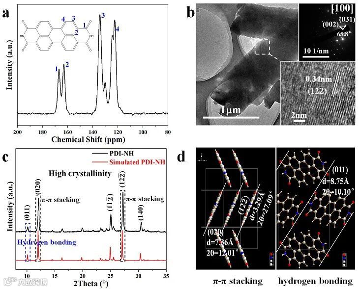 首先,采用咪唑溶剂法一步合成了高结晶PDI-NH超分子材料。固体核磁、高分辨透射电镜、X射线衍射等表征方法验证了PDI-NH材料具有准确的分子结构以及高结晶度。在咪唑溶剂中,PDI-NH分子通过π-π堆积、氢键等作用,自组装构筑高结晶结构。