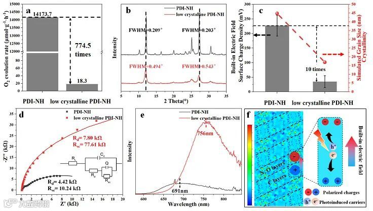 优异的光催化产氧性能归因于高结晶度构筑的内建电场,其可以有效地促进光生电荷的分离和迁移。相比于低结晶PDI-NH,高结晶PDI-NH具有降低的电化学阻抗,从而加速电荷分离。此外,高结晶PDI-NH的稳态荧光强度减弱,表明载流子复合过程被抑制。