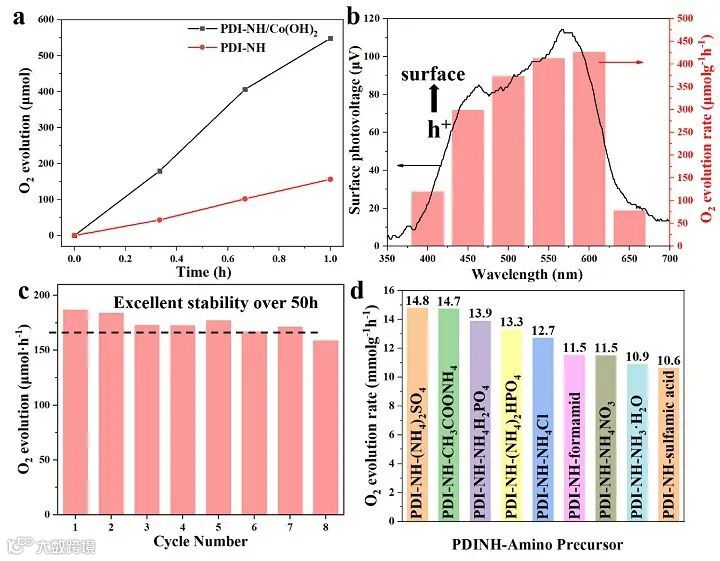 高结晶PDI-NH具有突破性的水分解产氧性能,产氧速率40.6 mmol g-1 h-11,折合609.7 μmol h-1。同时,PDI-NH结构稳定,可以重复使用50 h以上,产氧性能不衰减。此外,PDI-NH的制备方法具有普适性。各种不同氨基前驱体合成的PDI-NH超分子均具有优异的光催化水氧化性能。
