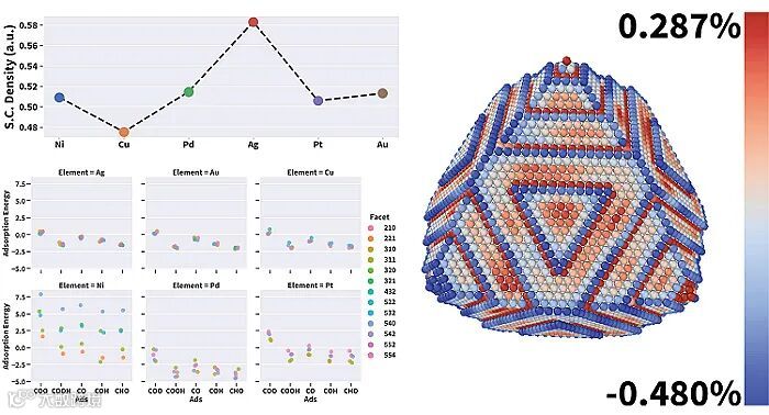 图1. 右:Ni (322) 高指数面纳米颗粒模型表面的原子受力分布映射。原子受到的张力性质以正负值作为区分:小于0时代表原子受到压缩应力,大于0时代表原子正受到拉伸应力。左上:后过渡金属的高指数面纳米颗粒强应力位点的峰值。左下:二氧化碳还原反应关键反应物在挑选的各金属高指数面纳米颗粒表面的吸附能。图片来源:Angew. Chem. Int. Ed.