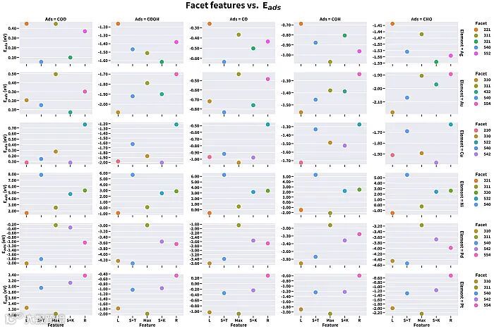图2. 二氧化碳还原关键反应物在以强应力位点密度大小为基础筛选出的各金属高指数面的吸附能强度。图片来源:Angew. Chem. Int. Ed.