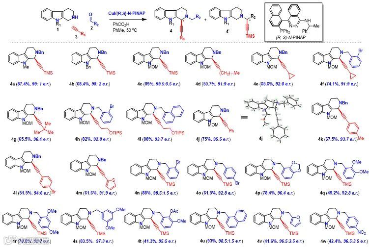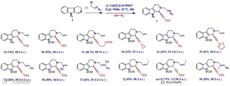 对三组分A3反应(醛、胺和炔)经过条件筛选发现,当吲哚氮上为MOM保护基时,手性配体N-PINAP可以给出82-99%ee的立体选择性炔基化产物。硅基、烷基和芳基取代的炔均可以取得较好的收率和立体选择性。但是醛的底物只适用于芳香醛,脂肪醛和α,β-不饱和醛均不能发生亚胺的异构化,只能生成4’的产物。这大大限制了该方法在天然产物全合成中的应用。例如,在氢化脱除苄基时,炔烃也会被还原。