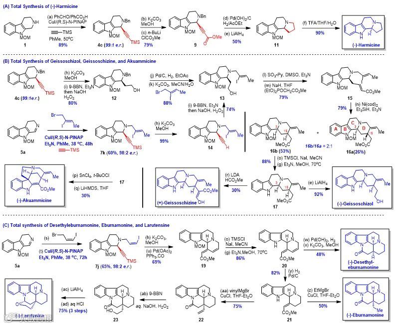 最后,作者利用该反应对七个吲哚生物碱进行了全合成研究。首先,对Harmicine的合成,还原炔烃与氢化脱苄基可以同时进行,5步总收率31%。如果将炔烃先经过硼氢化氧化转化为伯醇,再经Wittig反应引入酯基,进而经还原Heck关环,即可发散式地合成geissoschizol (7步, 总收率24%)、geissochizine (7步, 总收率8%) 和 akuammicine (7步, 总收率)。如果采用带有烯基碘的溴代物对二氢β咔啉直接烷基化得到亚胺盐的方法,即可对炔基化产物采用串联的Heck插羰反应关环,然后再对不饱和酯基还原或加成即可发散式地得到eburnamonine (5步, 24% overall yield)、desethyleburnamonine (5步, 总收率28%)和larutensine (8步, 总收率27%)。作者希望该方法可以在吲哚天然产物全合成中得到更广泛的应用。
