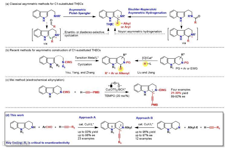 四氢β咔啉是天然吲哚生物碱和药物分子中非常常见的结构单元,而且它还是仿生重排到螺环氧化吲哚天然产物的前体,所以构建手性纯的四氢β咔啉引起了有机化学家极大的兴趣。通常四氢β咔啉是由不对称Pictet-Spengler反应来合成或者通过Bischler-Napieralski环化继而不对称氢化来合成。近期也有过渡金属催化环化和C-H氧化官能团化的方法被报道。通过对二氢β咔啉离子不对称炔基化来合成C-1取代的手性四氢β咔啉的方法少有人研究,到目前为止只有一例报道,而且收率较低,究其原因是因为二氢β咔啉离子通过共振较稳定使得其反应活性较低;并且吲哚环富电子易被氧化,构型呈平面较难进行手性控制。近日,香港科技大学童荣标团队在前期研究的基础上,发展了一类铜催化下高立体选择性对二氢β咔啉离子C-1炔基化的方法。该二氢β咔啉离子可由两个互为补充的方法得到:1)醛与四氢β咔啉缩合并异构化 2)二氢β咔啉的烷基化。该方法还被作为关键步应用到了七个天然产物的全合成中。研究中显示,吲哚上氮原子的保护基对立体选择性控制极为重要。
