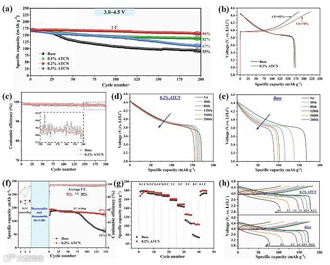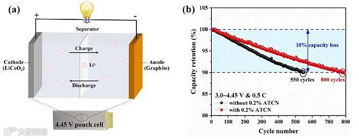 当在基础电解液中加入0.2% ATCN时,4.5V LiCoO2/Li电池在1 C循环200圈后的容量保持率从53%提高到91%,商业化4.45V LiCoO2/石墨软包电池(34 Ah)以0.5 C循环至容量衰减10%后的圈数从550圈增加到800圈。