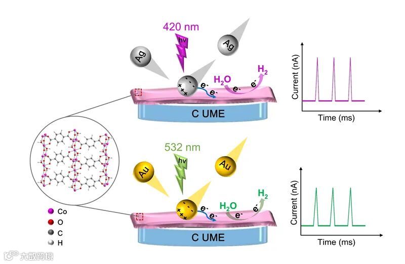 作者以Co-MOF纳米片电催化析氢反应(HER)为模型,首先在修饰电极上考察了金、银纳米颗粒的PEEC效应,明确只有在相应的共振波长光照下,金、银等离激元纳米颗粒才能显著增强HER的活性。