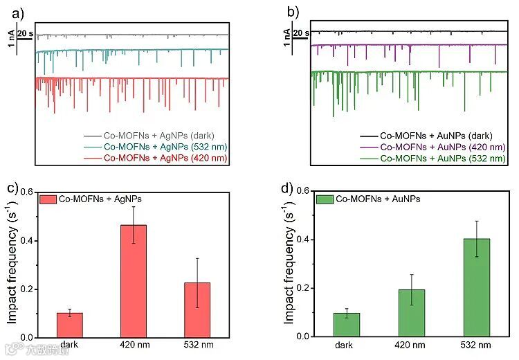 随后,作者在碳微电极上研究了单个金、银等离激元纳米颗粒与电极碰撞过程中的PEEC,在相应共振波长光照下观察到明显的瞬时电流信号。一系列对照试验表明,该信号来自于等离激元纳米颗粒与电极碰撞的瞬间在形成的金属/MOF肖特基结上增强HER的法拉第电子转移过程。通过对瞬时电流信号的分析,作者发现,相比于无光照以及非共振波长照射条件,共振波长光照下可显著增大瞬时电流信号的出现频率。由于光热效应可通过计算基本排除,该有效碰撞/反应几率的增大应来自于碰撞过程中热载流子的注入,从而降低了反应的活化能。