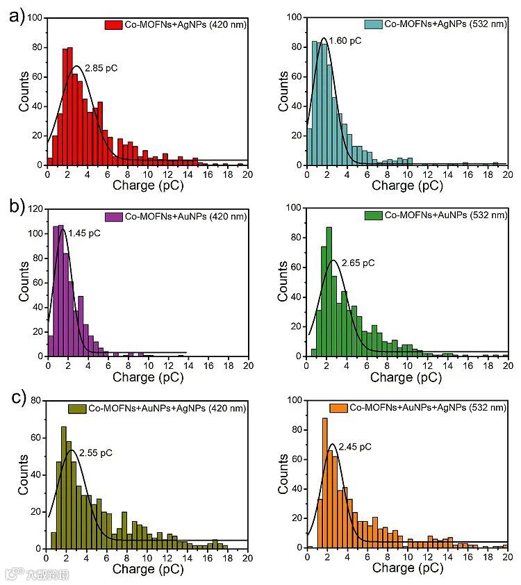 此外,作者还发现相比于无光照以及非共振波长照射条件,共振波长光照下可显著增大瞬时电流信号的电流强度,并基于此计算出金、银等离激元纳米颗粒的热载流子的注入可分别降低2.52 kJ/mol与2.85 kJ/mol的反应活化能。同时,作者通过金、银纳米颗粒碰撞过程中在两者共振波长光照下转移电荷数的不同,建立了区分混合体系中不同等离激元纳米颗粒的有效方法。