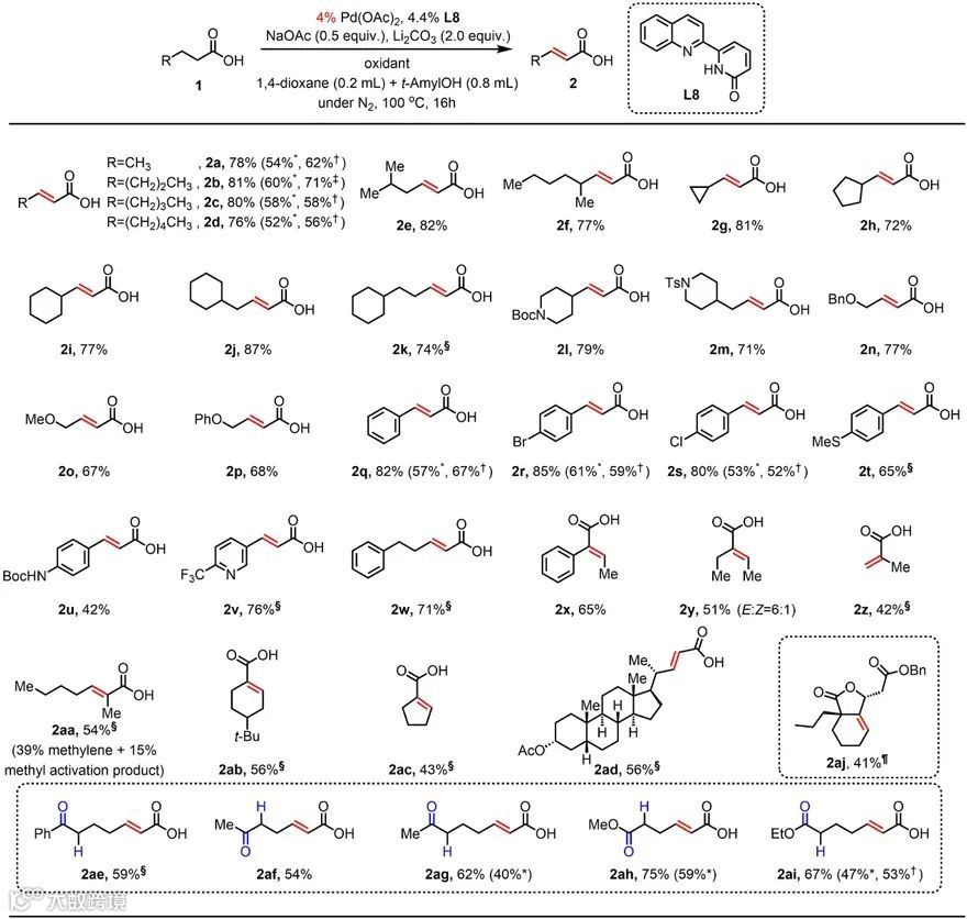 )均可顺利地进行脱氢反应,以中等至较好的产率构建了一系列α,β-不饱和酸。对于同时具有β-甲基和β-亚甲基C-H键的羧酸(
