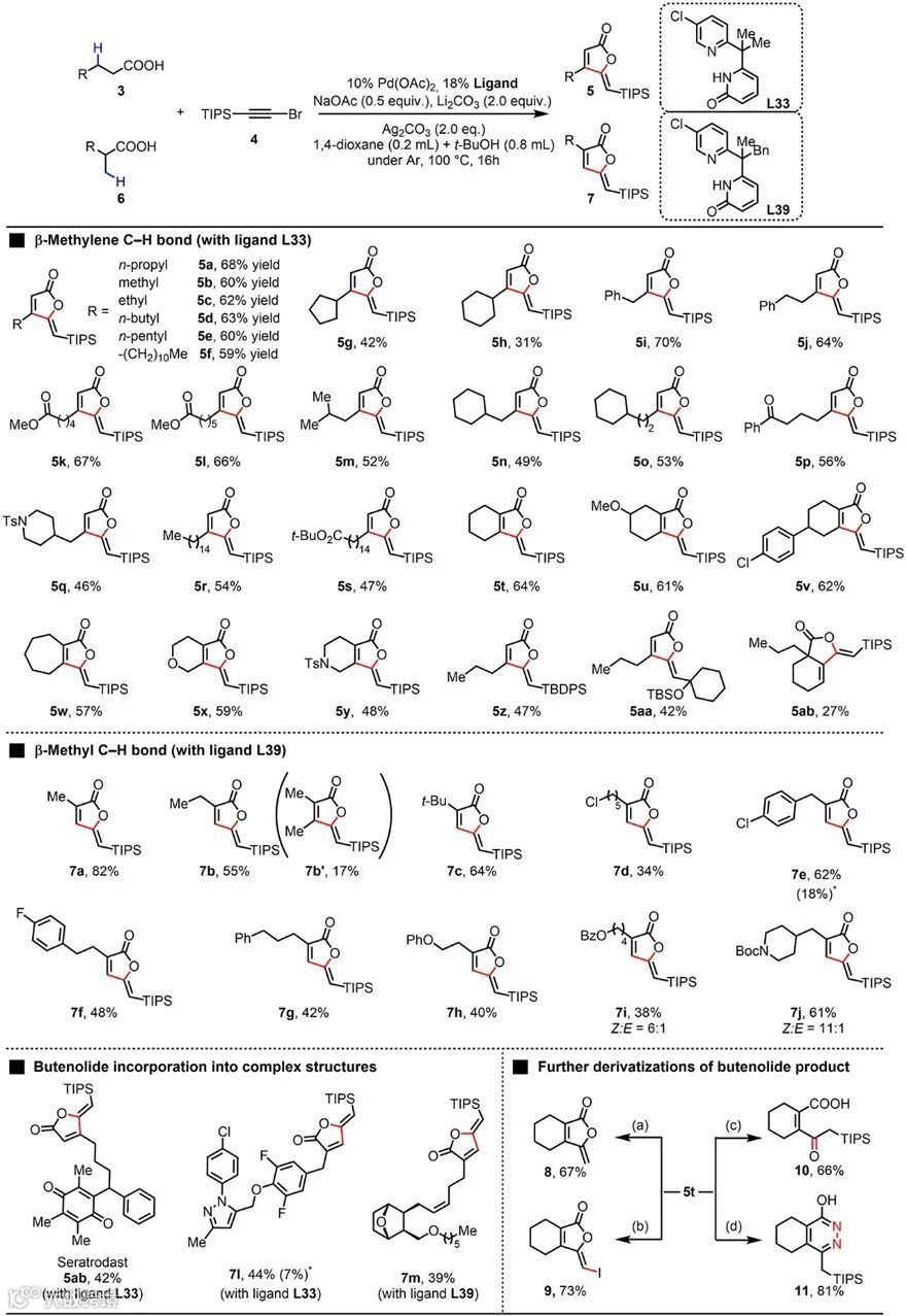 在最优条件下,作者对串联反应的底物范围进行了考察(图3),结果显示简单的链状脂肪族羧酸均能实现这一转化,以中等至良好的产率提供相应的β-取代γ-烷基丁烯内酯产物(