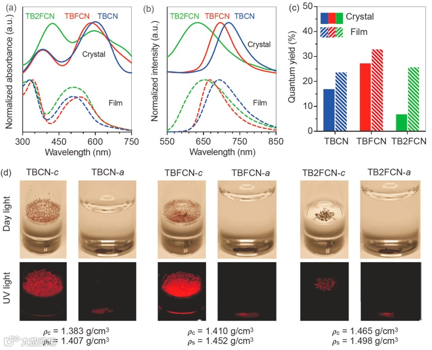 作者紧接着研究了三个红光分子在固态下的发光行为。由于TBCN和TBFCN晶体中存在着二聚体,分子间的相互作用力增强了体系的共轭程度,因此TBCN和TBFCN晶体的发光要比无定形态下更红;而TB2FCN由于分子过于扭曲,晶体中不存在二聚体,因此TB2FCN晶体的发光要比无定形态下更蓝。让人意外的是,三个红光分子在无定形态下的荧光量子产率要比晶态下更高。为了解释这个问题,作者通过密度对比实验证实三个分子在无定形态下具有更高的密度,因此更强的分子间相互作用力限制了分子的运动,从而使得无定形态下的发光更强(如图3)。