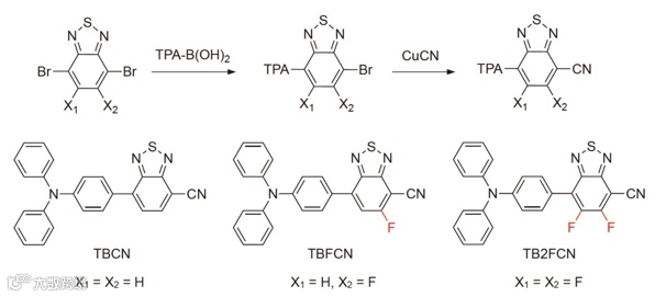 文章设计了一系列具有聚集诱导发光(AIE)性质的红光分子,并探索了在溶液态和固态下分子间相互作用力对它们发光性质的影响。作者首先利用Suzuki coupling的方法制备了具有分子内电荷转移(ICT)性质的三种红光分子,它们根据苯并噻二唑上氟原子数目的不同而被命名为TBCN,TBFCN和TB2FCN(图1)。