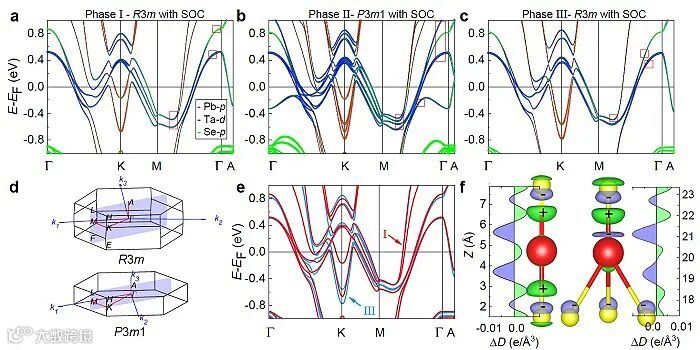利用同步辐射单晶X射线衍射技术,研究人员成功解析出不同温区下各相的原子结构,并对其结构相变的微观机制进行了详细研究(图3)。该堆垛相变不改变[Pb(TaSe2)2]模块层内原子分布,只涉及模块间的相对连续滑移,滑移基矢为[1/3,2/3,0],表明相变是罕见的公度平移相变。相变发生时,Pb-124由高温R3m相/ABC堆垛排列结构过渡为中间P3m1相/AB排列,最终转变为低温ACB排列,但仍为R3m结构,与高温相一致。文章指出Pb层和TaSe2层间的电荷转移是相变发生的内在原因。值得注意的是,在相变附近,Pb-124拥有巨大的负热膨胀效应,可能存在潜在应用。另外 Pb-124还是非中心对称超导体(Tc ≈1.8 K),能带计算预测该体系具有拓扑电子结构,可能为研究马约拉纳费米子提供平台(图4)。