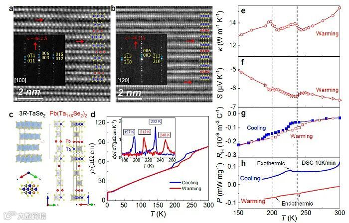 图2. Pb-(TaSe2)2材料的原子结构以及基本物性测量:高分辨透射电镜图、电阻率、热导率、热电势、霍尔系数以及DSC差热分析结果。