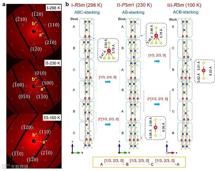 图3. 不同温度下的同步辐射单晶XRD的衍射图以及结构相变的微观示意图。