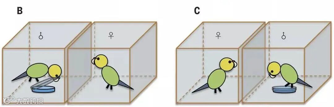 在这项研究中,中国科学家以虎皮鹦鹉为研究对象,为验证雌性关注并更喜欢雄性提取食物的认知能力这一假设开展了以下实验: