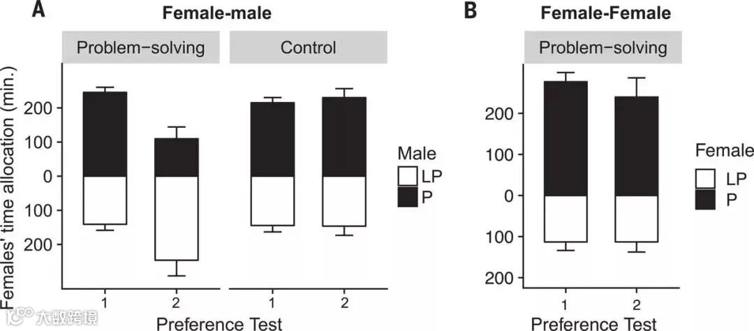 在观察到不太喜欢的男性成功解决问题和偏好男性的失败后,女性再次被允许在这些男性中进行选择(偏好测试2),雌性显著增加了花在不太喜欢的雄性附近的时间,同时减少了花在开始喜欢的雄性附近的时间。