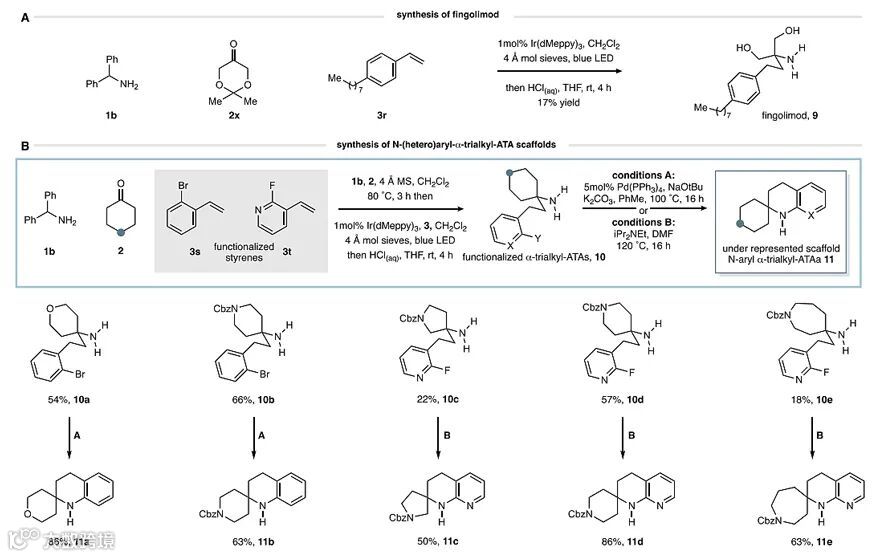 为了证明该反应的合成价值,作者从二苯甲胺1b、酮2x和4-辛基苯乙烯3r出发,在标准光催化条件下反应48 h,然后用酸性水溶液进行处理,以17%的收率得到Fingolimod(9,图6A),后者是一种受体调节剂,可用于治疗复发缓解型多发性硬化症。另外,作者还将一系列杂环酮与二苯甲胺1b、2-溴苯乙烯(3s)或2-氟-3-乙烯基吡啶(3t)进行反应,以良好的收率获得所需的α-三烷基-ATAs(10a-10e,图6B),其中10a和10b经钯介导的分子内Buchwald-Hartwig偶联反应得到相应的1,2,3,4-四氢喹啉(11a和11b)。类似地,10c-10e在Hünig碱和DMF的存在下于120 ℃下进行反应,以较好的收率得到相应的1,2,3,4-四氢萘啶(11c-11e)。