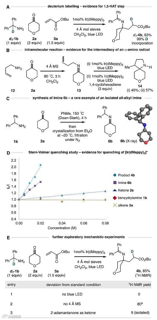 接下来,作者进行了一系列机理研究。如图7A所示,当酮2a、烯烃3a和α-氘代二苯甲胺(d1-1b)在标准条件下进行反应时,以接近定量的氘掺入率在酯基的邻位C-H键进行氘代并获得相应的亚胺产物d1-4b,进一步证实了1,5-HAT过程。另外,作者将3-丁烯胺12和酮2a进行缩合得到相应的亚胺13,后者在标准条件下进行反应,以中等的收率得到杂螺环14(图7B),这可能是由于α-氨基自由基中间体与侧链烯烃发生分子内5-exo-trig闭环以及随后的HAT过程导致的。接着,作者在Ir(dMeppy)3的存在下,对二苯甲胺1b、酮2a、烯烃3a、亚胺 6b 和产物4b的溶液分别进行了Stern-Volmer 猝灭实验,结果表明亚胺6b是Ir(dMeppy)3激发态的有效猝灭剂(图7D)。需要指出的是,反应中存在的4 Å分子筛既可以作为Lewis酸,也可以与水相互作用产生质子源。然而,当分离出的亚胺在没有4 Å分子筛的条件下进行反应时,仍能以80%的收率得到产物4b(图7E,entry 2),这意味着其它过程也会产生质子,即亚胺6b的互变异构体烯胺15经单电子氧化形成自由基阳离子int-VIb,后者的酸性N-H键能够实现亚胺6b的质子化,从而形成酮亚胺阳离子中间体int-Ib。