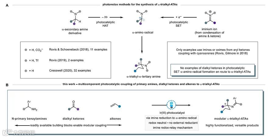 近年来,化学家们利用可见光介导的光氧化还原催化实现了α-三烷基-α-叔胺的合成(图2A),即通过伯胺的直接α-氢原子转移(HAT)和酮亚胺的单电子还原(SET)产生α-氨基自由基,后者可进一步转化为α-三烷基-α-叔胺。不过,这些反应的底物局限性较大。在此基础上,英国剑桥大学的Matthew J. Gaunt教授课题组从二烷基酮、苄胺和烯烃三种组分出发,利用可见光介导的光催化实现了一系列α-三烷基-α-叔胺的模块化合成(图2B)。具体而言,酮和伯胺原位生成二烷基亚胺,后者经可见光介导的单电子还原生成α-氨基自由基中间体,该自由基可与一系列烯烃发生Giese型加成反应,从而形成所需的α-三烷基-α-叔胺中心。相关成果于近期发表在J. Am. Chem. Soc. 上。