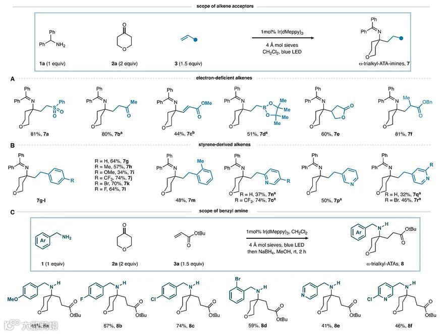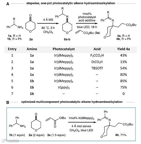 首先,作者选择苄胺1a、酮2a为模板底物,在4 Å分子筛的作用下原位形成亚胺6a,后者和丙烯酸叔丁酯3a在Ir(dMeppy)3(1 mol%)和少量酸添加剂的存在下用蓝色LED灯进行辐照,均能得到所需的目标产物4a,尽管收率较低(图3A,entry 1-3)。有趣的是,当反应中没有酸添加剂时,反应收率较高(80%)。为此,作者对反应条件进行了优化,结果显示二苯甲胺1b的反应效果更好,能以85%的收率获得更稳定的二苯甲酮亚胺产物4b,并且产物在色谱纯化后易分离。另外,对照实验表明没有光催化剂反应无法进行。值得一提的是,作者发现亚胺的预缩合并不是必需的,胺1b、酮2a、丙烯酸叔丁酯3a、光催化剂和分子筛可以一锅法进行多组分反应,以71%的收率得到所需产物4b(图3B)。