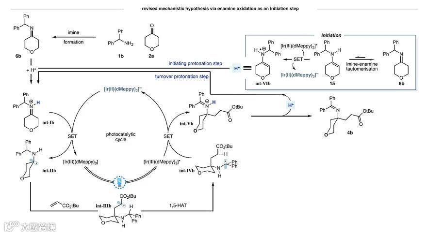 在此基础上,作者提出了可能的反应机理(图8)。首先,二苯甲胺1b和酮2a原位形成亚胺6b,后者经质子化生成酮亚胺阳离子中间体int-Ib。接着,Int-Ib被[Ir(II)(dMeppy)3]-还原为α-氨基自由基int-IIb,后者与烯烃3a发生Giese加成得到中间体int-IIIb,然后经1,5-HAT过程生成二苯基取代的α-氨基自由基int-IVb。随后,int-IVb被[Ir(III)(dMeppy)3]*氧化为酮亚胺阳离子int-Vb,同时再生还原性物种[Ir(II)(dMeppy)3]-来关闭光催化循环。最后,酮亚胺阳离子int-Vb与起始亚胺6b进行质子转移便可得到最终产物4b。