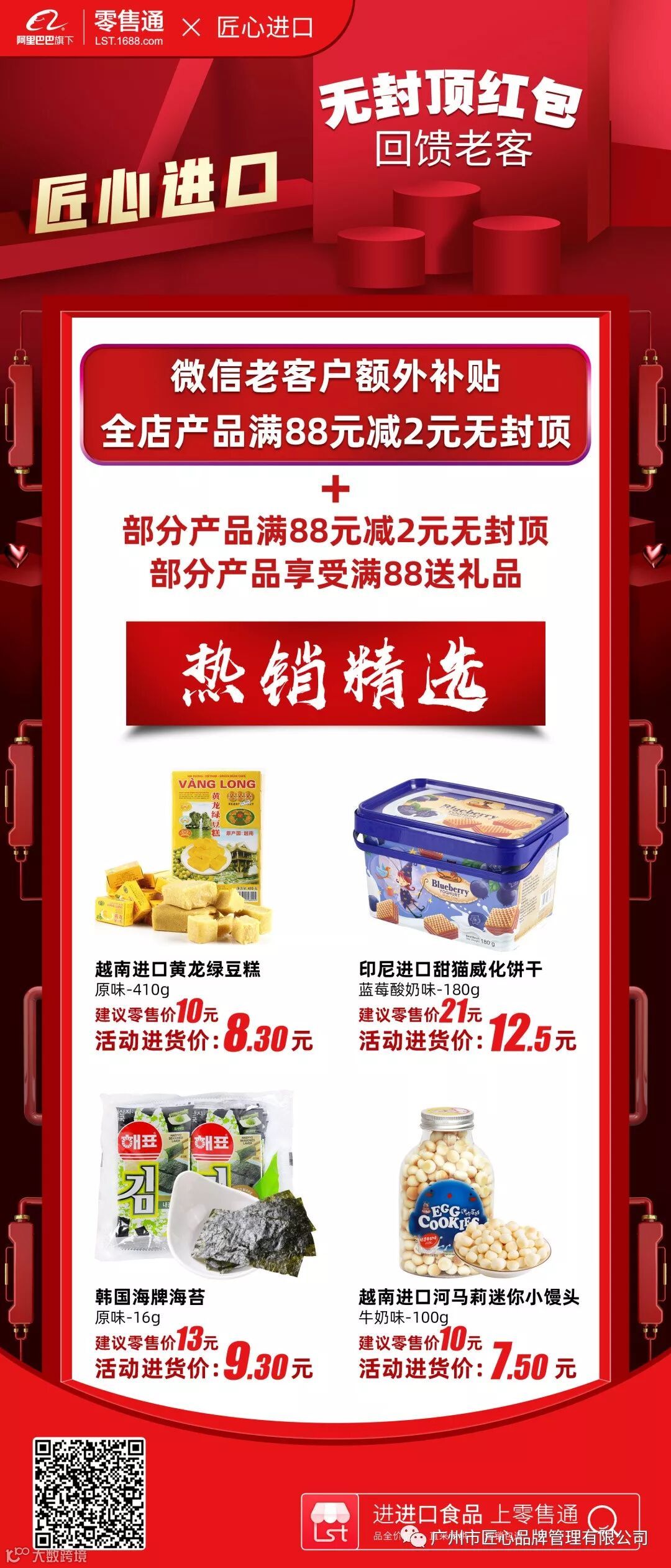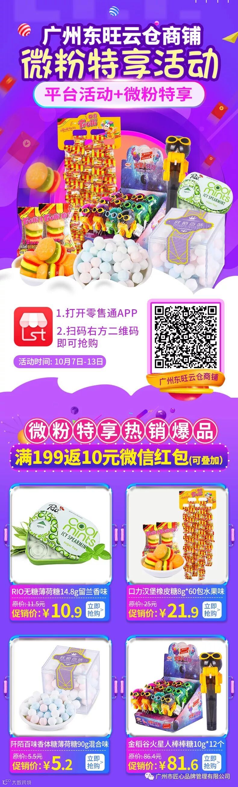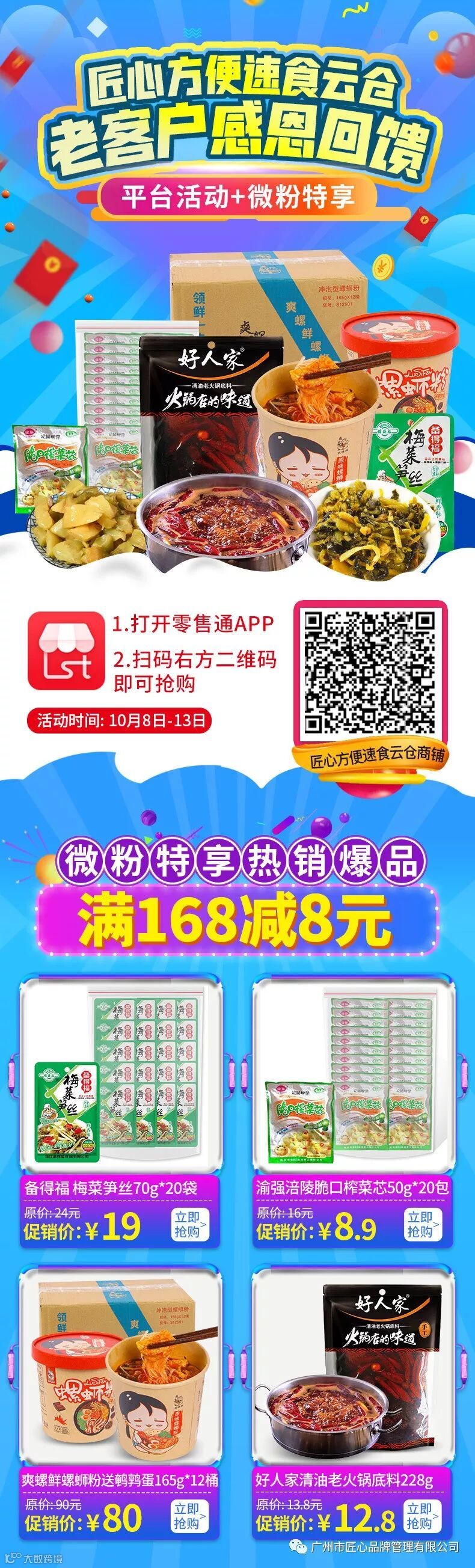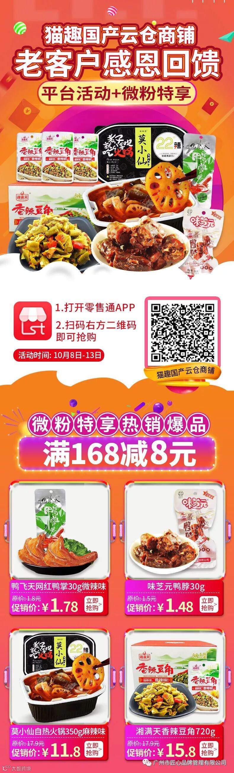 新一期(10.8-10.13)的活动又来了,这次针对我们匠心品牌旗下猫趣国产、匠心方便速食、东旺云仓及匠心进口等四家店铺的微粉推出的感恩回馈活动,微粉除了正常享受店铺上面的满减或满赠活动外,还可以享受以下微粉特享活动,双重优惠,力度空前。各位老板千万不要错过呦
