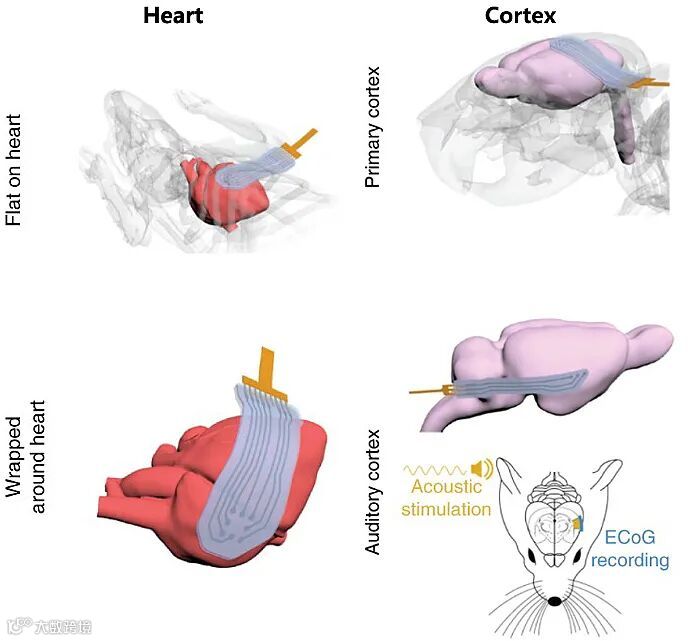 最后,研究者对电极进行了体内实验,将粘弹性阵列贴在啮齿动物的心脏,记录心电图阵列弯曲度超过180°,仍能正常工作,信噪比为15.6。随后,阵列被贴在小鼠的大脑皮层,通过光或声音的刺激,诱导皮层底层的电活动,并记录信号。