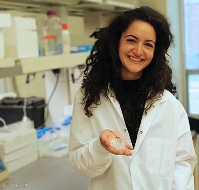 Christina Tringides(本文一作)手持贴有水凝胶电极的大脑模型。图片来源:哈佛大学Wyss研究所 [1]