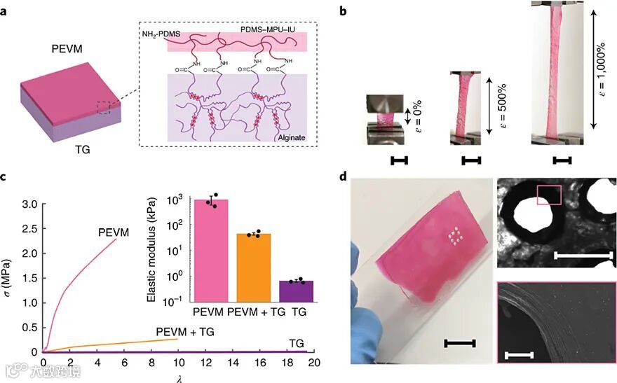 由于海藻酸钠水凝胶通过离子进行交联,自身不具有绝缘性,因此需要在表面添加粘弹性封装层。研究者选择了以氨基封端的PDMS,通过与海藻酸钠中的羧基相结合,增强了二者间的作用力,拉伸到自身长度的10倍也不会破损。