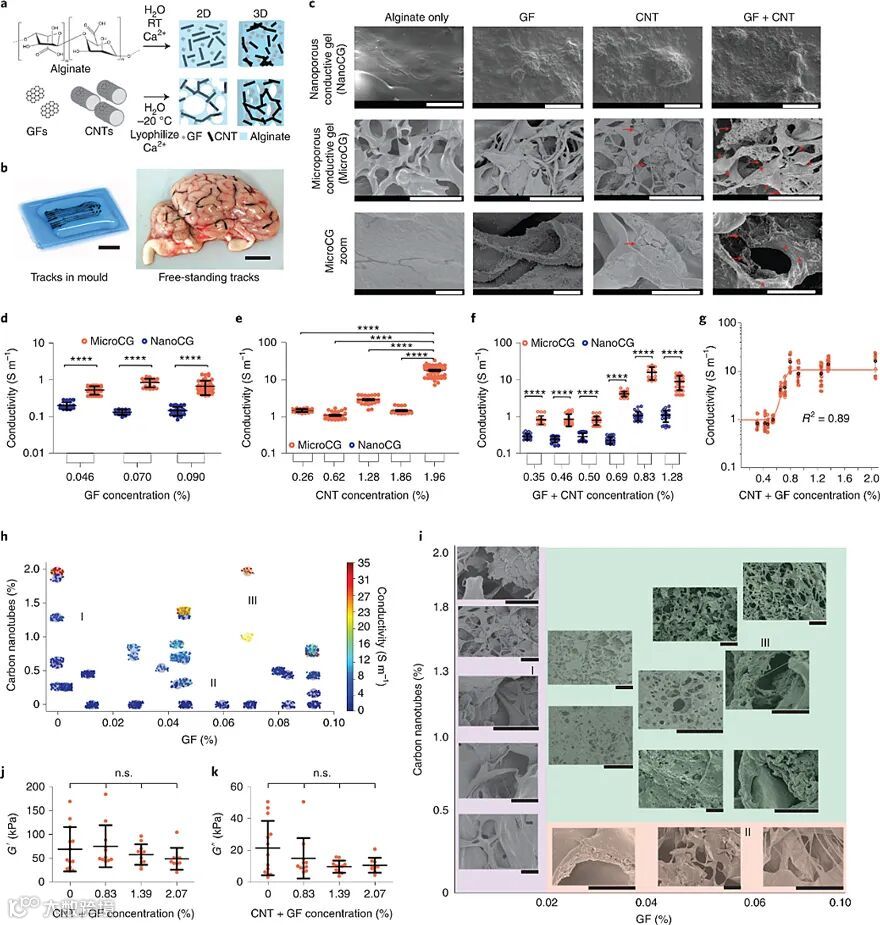 如何将海藻酸钠水凝胶变成粘弹性电极阵列呢?研究者将碳纳米管(CNT)和石墨烯薄片(GF)嵌入柔性水凝胶来实现导电,电导率最高可达35 S m–1。其中,GF贴附到微孔水凝胶的孔壁上,而CNT则形成致密的节点。