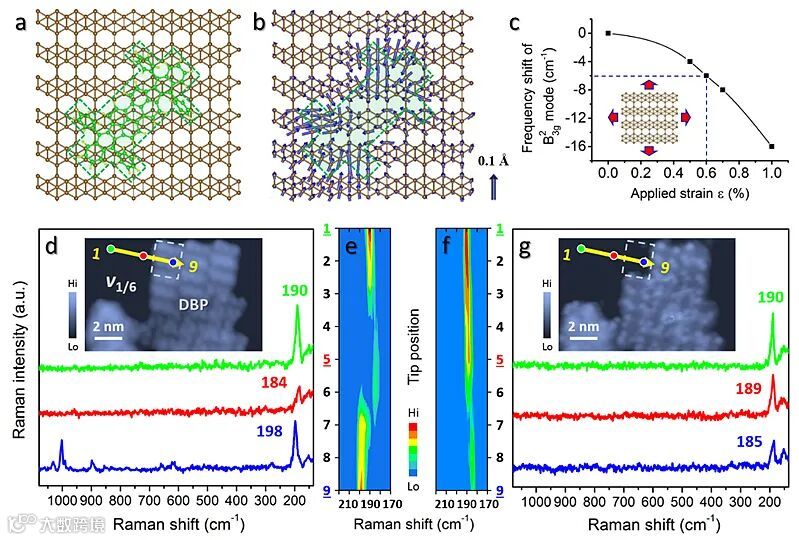 最近,伊利诺伊大学芝加哥分校(UIC)江楠课题组的李林飞博士等人报道了一种有机/硼烯(DBP/borophene)垂直异质结构,并利用UHV-TERS ~5 Å的化学空间分辨研究了其原子尺度的界面相互作用(图1)。实验表明TERS不仅可以确定吸附于硼烯不同结构相(v1/6和v1/5)表面的DBP分子的振动指纹,还可以把超高的化学敏感性向下延伸至亚表层的DBP/borophene垂直界面,即可以谱学可视被覆盖的硼烯基底的结构和化学特征。如图2d所示,吸附于硼烯表面的DBP分子展现了其近似本征的拉曼谱(气态DBP),表明了DBP与硼烯表面非常弱的相互作用。然而,TERS谱显示被分子吸附的硼烯的特征峰发生了明显的蓝移,表明硼烯晶格由于吸附作用发生了压缩应变。较弱的吸附作用亦可以引起硼烯可观测的晶格变化,得益于硼烯单原子层超高的平面延展性和柔韧性。由于TERS对垂直界面结构性质的高敏感性,研究者可以利用TERS对硼烯基底进行二维TERS谱成像。如图2e-f所示,虽然被DBP分子层完全覆盖,硼烯的两种结构相仍然可以被清楚地识别和区分。据此,研究者勾勒出了分子吸附留下的“痕”,如飞鸿印雪。