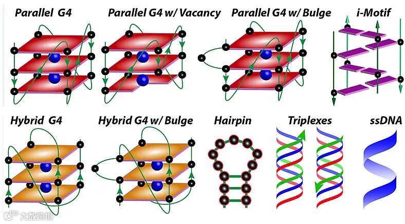 DNA是储存遗传信息的生物大分子。它的碱基序列包含了指导蛋白合成的指令,同时它也可以形成不同的构象,比如经典的DNA双螺旋结构,及非经典的G-四链体(G4)、H-DNA、hairpin和i-motif结构等等。其中G4还可以分为不同的拓扑结构,即平行、反平行和混合型,并且G4中还可以存在凸起或者空位(图1)。H-DNA则根据其第三条链的走向,分为平行和反平行两种类型。DNA的折叠构象对DNA的稳定性和基因表达等都有调控作用。解析DNA的折叠构象有助于加深我们对其生物学功能的理解,并对开发靶向该结构的治疗手段具有指导意义。然而,DNA构象的多样性,某些结构的高度相似,及构象形成对溶液环境(比如缓冲溶液的pH、离子种类、浓度等)的要求,使得DNA构象分析充满了严峻的挑战。