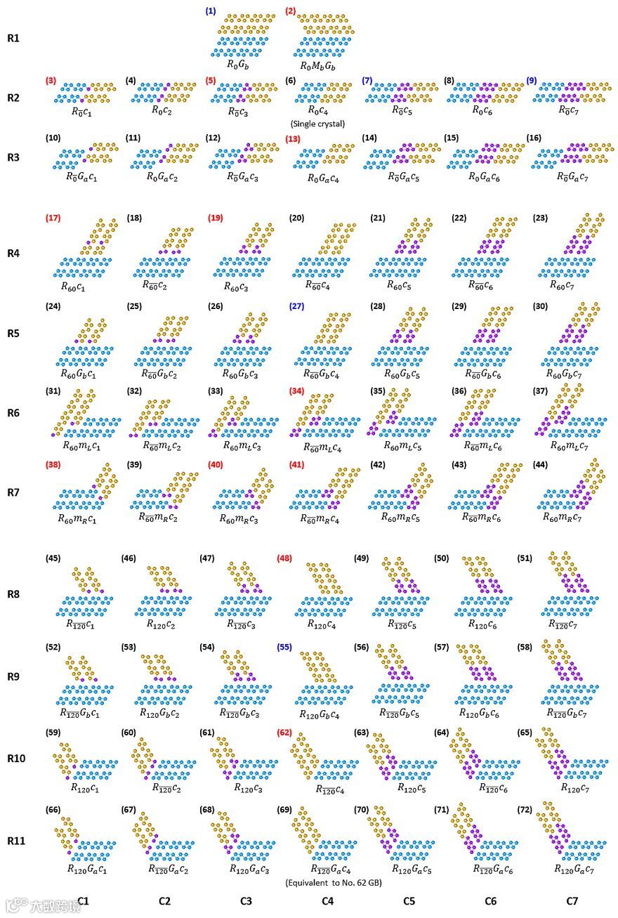 基于原子结构模型和基本对称操作,研究者可以原则上给出某个材料体系的所有晶界类型。该论文通过旋转、镜像和滑移等基本对称操作,构筑了包含70种不同晶界构型的T″相TMDs体系的共格晶界完备集并以相应的对称操作对其进行系统命名(图2),其中蓝色标号的5种晶界结构为实验中首次观察到的晶界构型。