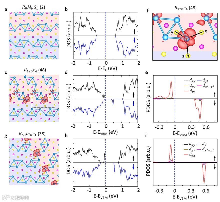 此外,作者发现晶界处Re-Re键的成键状态差异可导致不同的局域电子结构。如图4a, 4b所示,α晶界中的Re-Re键保持了和单晶中相同的饱和状态,因此α晶界也保留了单层ReSe2的典型半导体特征。在β晶界处,未饱和的晶界Re原子导致其电子结构在本征带隙中出现了两个自旋极化的能隙态。它们一个是靠近价带顶的浅能级,另一个是距价带顶0.5 eV的深能级,均来源于未饱和Re原子5dxz原子轨道的贡献(图4c-4f)。γ晶界中同样存在未饱和的晶界Re原子,因此,其电子结构也具有两个源于未饱和Re原子5dxz原子轨道的自旋极化能隙态,但它们均处于能隙中较深的位置(图4g-4i)。