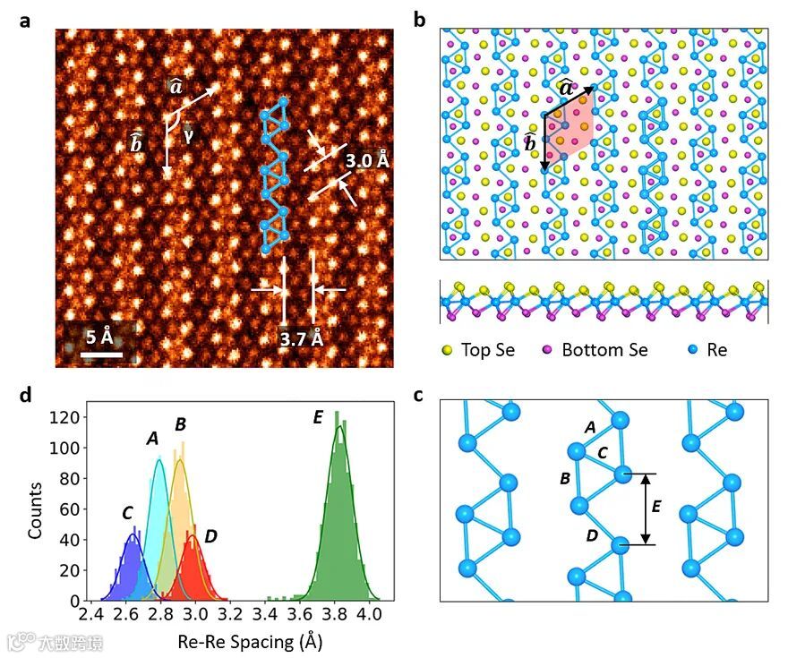 近日,中国科学院大学周武教授课题组和中国人民大学季威教授课题组、新加坡南洋理工大学刘政教授课题组合作,结合原子分辨扫描透射电子显微镜(STEM)成像和第一性原理计算,系统研究了单层T″相ReSe2中共格晶界(coherent boundary)的所有可能结构和对应的局域电子结构,并进一步揭示了该体系中独特的由非饱和Re-Re键诱导的多种自旋极化能隙态。单层ReSe2的面内各向异性结构特征如图1所示。实空间STEM原子分辨成像和相应的原子结构模型表明,每4个Re原子聚集成一个Re4团簇,通过团簇间Re-Re键连接形成一维Re4链。合作研究团队统计了实验图像中Re-Re原子间的5个特征长度(图1c,图1d),发现成键的Re-Re间距A-D与未成键的间距E之间存在明显差异,并依此将Re-Re的成键判定阈值设为3.2 Å。