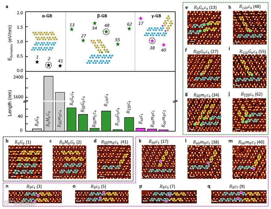 通过计算晶界形成能,作者发现这些晶界的稳定性各不相同,其中Re-Re配位数保持为3的α晶界最易形成,团簇间Re-Re键断裂的β晶界和团簇内Re-Re键断裂的γ晶界则均具有较高的形成能(如图3a所示),这也与基于实验观察的晶界长度统计结果基本相符。图3b-3q进一步展示了几类典型晶界的原子分辨STEM图像。
